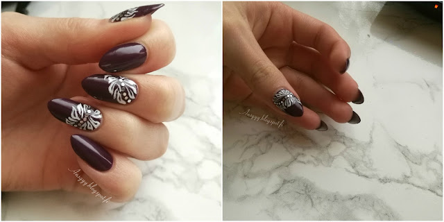 Pohjalla siis näissä Essencen ihana sysitumma creme, Amazed By You. Tämä onkin toiminut jo kahden vuoden ajan mun yhtenä lempparina syksylakkana, joka poikkeuksetta aina syksyllä (ja vähän muulloinkin) pääsee kynsiä koristamaan. Kahden helpon lakkakerroksen päälle pääsi taas repertuaarini mukaan maalailuja sekä gllitteriä. Maalauksiin löysin idean sieltä tutusta ja turvallisesta pinterestistä ja inspiraationlähteen voit nähdä tästä.